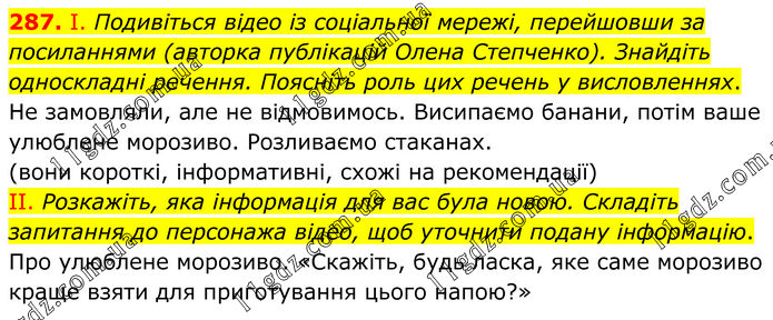 287. І. Подивіться відео із соціальної мережі, перейшовши за посиланнями (авторка публікацій Олена Степченко). Знайдіть односкладні речення. Поясніть роль цих речень у висловленнях. Не замовляли, але не відмовимось. Висипаємо банани, потім ваше улюблене морозиво. Розливаємо стаканах. (вони короткі, інформативні, схожі на рекомендації) II. Розкажіть, яка інформація для вас була новою. Складіть запитання до персонажа відео, щоб уточнити подану інформацію. Про улюблене морозиво. «Скажіть, будь ласка, яке саме морозиво краще взяти для приготування цього напою?»