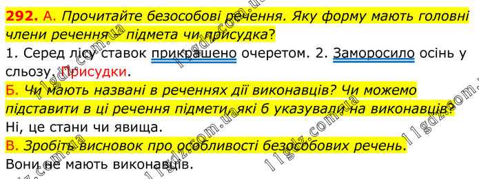 292. А. Прочитайте безособові речення. Яку форму мають головні члени речення – підмета чи присудка? 1. Серед лісу ставок прикрашено очеретом. 2. Заморосило осінь у сльозу. Присудки. Б. Чи мають названі в реченнях дії виконавців? Чи можемо підставити в ці речення підмети, які б указували на виконавців? Ні, це стани чи явища. В. Зробіть висновок про особливості безособових речень. Вони не мають виконавців.