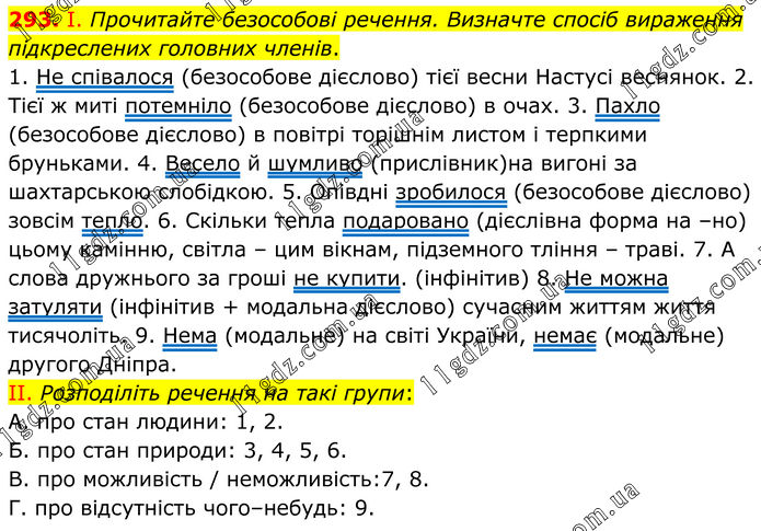 293. І. Прочитайте безособові речення. Визначте спосіб вираження підкреслених головних членів. 1. Не співалося (безособове дієслово) тієї весни Настусі веснянок. 2. Тієї ж миті потемніло (безособове дієслово) в очах. 3. Пахло (безособове дієслово) в повітрі торішнім листом і терпкими бруньками. 4. Весело й шумливо (прислівник)на вигоні за шахтарською слобідкою. 5. Опівдні зробилося (безособове дієслово) зовсім тепло. 6. Скільки тепла подаровано (дієслівна форма на –но) цьому камінню, світла – цим вікнам, підземного тління – траві. 7. А слова дружнього за гроші не купити. (інфінітив) 8. Не можна затуляти (інфінітив + модальна дієслово) сучасним життям життя тисячоліть. 9. Нема (модальне) на світі України, немає (модальне) другого Дніпра. II. Розподіліть речення на такі групи: А. про стан людини: 1, 2. Б. про стан природи: 3, 4, 5, 6. В. про можливість / неможливість: 7, 8. Г. про відсутність чого–небудь: 9.