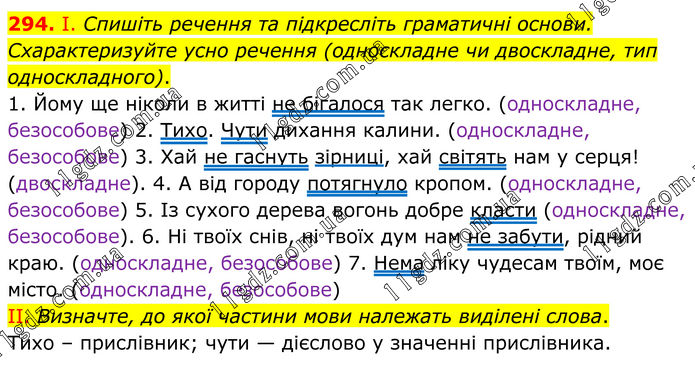 294. І. Спишіть речення та підкресліть граматичні основи. Схарактеризуйте усно речення (односкладне чи двоскладне, тип односкладного). 1. Йому ще ніколи в житті не бігалося так легко. (односкладне, безособове) 2. Тихо. Чути дихання калини. (односкладне, безособове) 3. Хай не гаснуть зірниці, хай світять нам у серця! (двоскладне). 4. А від городу потягнуло кропом. (односкладне, безособове) 5. Із сухого дерева вогонь добре класти (односкладне, безособове). 6. Ні твоїх снів, ні твоїх дум нам не забути, рідний краю. (односкладне, безособове) 7. Нема ліку чудесам твоїм, моє місто. (односкладне, безособове) II. Визначте, до якої частини мови належать виділені слова. Тихо – прислівник; чути — дієслово у значенні прислівника.