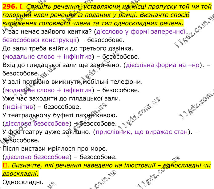 296. І. Спишіть речення, уставляючи на місці пропуску той чи той головний член речення із поданих у рамці. Визначте спосіб вираження головного члена та тип односкладних речень. У вас немає зайвого квитка? (дієслово у формі заперечної безособової конструкції) – безособове. До зали треба ввійти до третього дзвінка. (модальне слово + інфінітив) – безособове. Вхід до глядацької зали ще зачинено. (дієслівна форма на –но). – безособове. У залі потрібно вимкнути мобільні телефони. (модальне слово + інфінітив) – безособове. Уже час заходити до глядацької зали. (інфінітив) – безособове. У театральному буфеті пахне кавою. (дієслово безособове) – безособове. У фоє театру дуже затишно. (прислівник, що виражає стан). – безособове. Після вистави мріялося про море. (дієслово безособове) – безособове. II. Визначте, які речення наведено на ілюстрації – односкладні чи двоскладні. Односкладні.