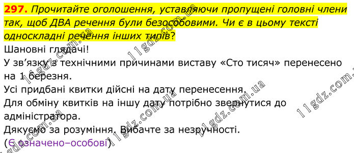 297. Прочитайте оголошення, уставляючи пропущені головні члени так, щоб ДВА речення були безособовими. Чи є в цьому тексті односкладні речення інших типів? Шановні глядачі! У зв’язку з технічними причинами виставу «Сто тисяч» перенесено на 1 березня. Усі придбані квитки дійсні на дату перенесення. Для обміну квитків на іншу дату потрібно звернутися до адміністратора. Дякуємо за розуміння. Вибачте за незручності. (Є означено–особові)