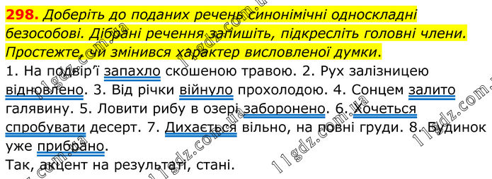 298. Доберіть до поданих речень синонімічні односкладні безособові. Дібрані речення запишіть, підкресліть головні члени. Простежте, чи змінився характер висловленої думки. 1. На подвір’ї запахло скошеною травою. 2. Рух залізницею відновлено. 3. Від річки війнуло прохолодою. 4. Сонцем залито галявину. 5. Ловити рибу в озері заборонено. 6. Хочеться спробувати десерт. 7. Дихається вільно, на повні груди. 8. Будинок уже прибрано. Так, акцент на результаті, стані.