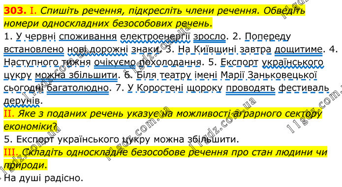 303. І. Спишіть речення, підкресліть члени речення. Обведіть номери односкладних безособових речень. 1. У червні споживання електроенергії зросло. 2. Попереду встановлено нові дорожні знаки. 3. На Київщині завтра дощитиме. 4. Наступного тижня очікуємо похолодання. 5. Експорт українського цукру можна збільшити. 6. Біля театру імені Марії Заньковецької сьогодні багатолюдно. 7. У Коростені щороку проводять фестиваль дерунів. II. Яке з поданих речень указує на можливості аграрного сектору економіки? 5. Експорт українського цукру можна збільшити. III. Складіть односкладне безособове речення про стан людини чи природи. На душі радісно.