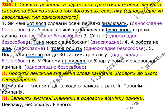 306. І. Спишіть речення та підкресліть граматичні основи. Запишіть скорочено біля кожного з них його характеристику (односкладне чи двоскладне, тип односкладного). 1. Як мені хотілося словами осені пейзажі змалювать. (односкладне безособове) 2. У малесенькій тісній халупці було вогко і трохи душно. (односкладне безособове) 3. Світає (односкладне безособове). Тане морок в небосхилі (двоскладне). 4. А робота не жде. (двоскладне) Її треба робить (односкладне безособове). 5. Подекуди намело аж до 30 сантиметрів снігу. (односкладне безособове) 6. У Рівному проведено вебінар у рамках оздоровчої кампанії. (односкладне безособове) II. Поясніть лексичне значення слова кампанія. Доберіть до цього слова паронім. Кампанія — системні дії, заходи в рамках стратегії. Паронім — компанія. III. Запишіть виділені іменники в родовому відмінку однини. Пейзажу, небосхилу, Рівного.