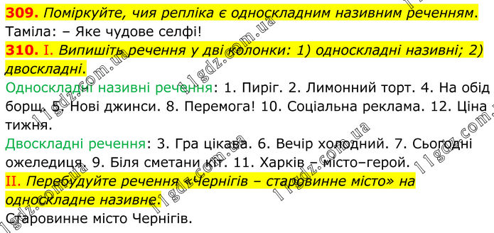 309. Поміркуйте, чия репліка є односкладним називним реченням. Таміла: – Яке чудове селфі! 310. І. Випишіть речення у дві колонки: 1) односкладні називні; 2) двоскладні. Односкладні називні речення: 1. Пиріг. 2. Лимонний торт. 4. На обід борщ. 5. Нові джинси. 8. Перемога! 10. Соціальна реклама. 12. Ціна тижня. Двоскладні речення: 3. Гра цікава. 6. Вечір холодний. 7. Сьогодні ожеледиця. 9. Біля сметани кіт. 11. Харків – місто–герой. II. Перебудуйте речення «Чернігів – старовинне місто» на односкладне називне. Старовинне місто Чернігів.