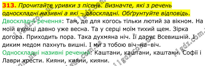 313. Прочитайте уривки з пісень. Визначте, які з речень односкладні називні а які – двоскладні. Обґрунтуйте відповідь. Двоскладні речення: Там, де для когось тільки лютий за вікном. На моїй вулиці давно уже весна. Та у серці моїм тихий щем. Зірка догора. Приходить пора. Така духмяна ніч. Її дарує Всевишній. І диким медом пахнуть вишні. І ми з тобою віч–на–віч. Односкладні називні речення: Каштани, каштани, каштани. Софії і Лаври хрести. Кияни, кияни, кияни.