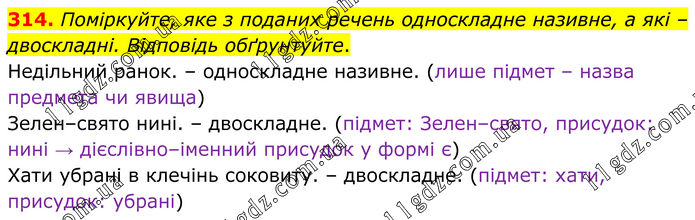 314. Поміркуйте, яке з поданих речень односкладне називне, а які – двоскладні. Відповідь обґрунтуйте. Недільний ранок. – односкладне називне. (лише підмет – назва предмета чи явища) Зелен–свято нині. – двоскладне. (підмет: Зелен–свято, присудок: нині → дієслівно–іменний присудок у формі є) Хати убрані в клечінь соковиту. – двоскладне. (підмет: хати, присудок: убрані)