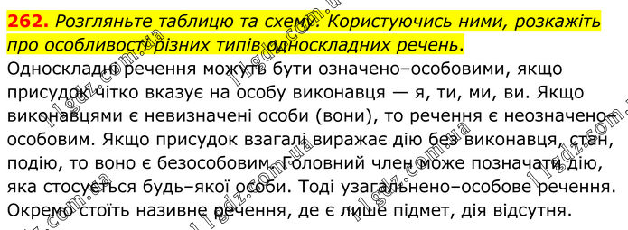 262. Розгляньте таблицю та схему. Користуючись ними, розкажіть про особливості різних типів односкладних речень. Односкладні речення можуть бути означено–особовими, якщо присудок чітко вказує на особу виконавця — я, ти, ми, ви. Якщо виконавцями є невизначені особи (вони), то речення є неозначено–особовим. Якщо присудок взагалі виражає дію без виконавця, стан, подію, то воно є безособовим. Головний член може позначати дію, яка стосується будь–якої особи. Тоді узагальнено–особове речення. Окремо стоїть називне речення, де є лише підмет, дія відсутня.