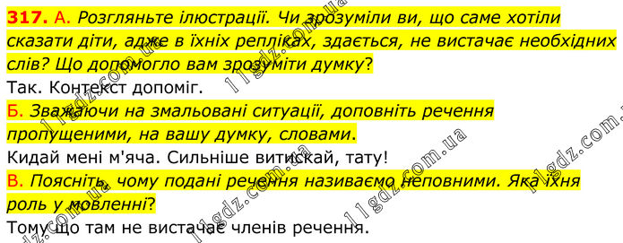 317. А. Розгляньте ілюстрації. Чи зрозуміли ви, що саме хотіли сказати діти, адже в їхніх репліках, здається, не вистачає необхідних слів? Що допомогло вам зрозуміти думку? Так. Контекст допоміг. Б. Зважаючи на змальовані ситуації, доповніть речення пропущеними, на вашу думку, словами. Кидай мені м'яча. Сильніше витискай, тату! В. Поясніть, чому подані речення називаємо неповними. Яка їхня роль у мовленні? Тому що там не вистачає членів речення.