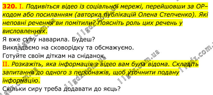 320. І. Подивіться відео із соціальної мережі, перейшовши за ОР–кодом або посиланням (авторка публікацій Олена Степченко). Які неповні речення ви помітили? Поясніть роль цих речень у висловленнях. Я вже супу наварила. Будеш? Викладаємо на сковорідку та обсмажуємо. Готуйте своїм діткам на сніданок. II. Розкажіть, яка інформація з відео вам була відома. Складіть запитання до одного з персонажів, щоб уточнити подану інформацію. Скільки сиру треба додавати до яєць?