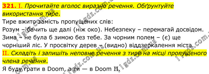 321. І. Прочитайте вголос виразно речення. Обґрунтуйте використання тире. Тире вжито замість пропущених слів: Розум – бачить ще далі (ніж око). Небезпеку – перемагай досвідом. Зима – не була б зимою без тебе. За чорним полем – (є) ще чорніший ліс. У просвітку дерев – (видно) віддзеркалення міста. II. Складіть і запишіть неповне речення з тире на місці пропущеного члена речення. Я буду грати в Doom, а ти — в Doom II.