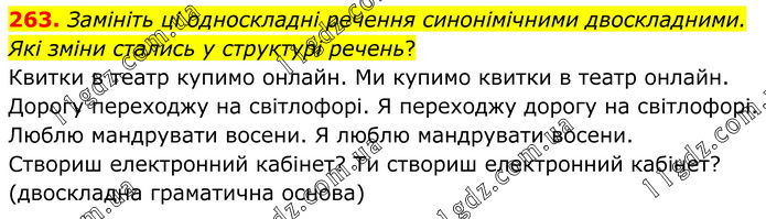 263. Замініть ці односкладні речення синонімічними двоскладними. Які зміни стались у структурі речень? Квитки в театр купимо онлайн. Ми купимо квитки в театр онлайн. Дорогу переходжу на світлофорі. Я переходжу дорогу на світлофорі. Люблю мандрувати восени. Я люблю мандрувати восени. Створиш електронний кабінет? Ти створиш електронний кабінет? (двоскладна граматична основа)