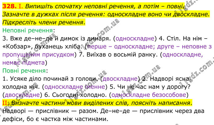 328. І. Випишіть спочатку неповні речення, а потім – повні. Зазначте в дужках після речення: односкладне воно чи двоскладне. Підкресліть члени речення. Неповні речення: 3. Вже де–не–де й димок із димаря. (односкладне) 4. Стіл. На нім – «Кобзар», буханець хліба. (перше – односкладне; друге – неповне з пропущеним присудком) 7. Виїхав о восьмій ранку. (односкладне, немає підмета) Повні речення: 1. Усяке діло починай з голови. (двоскладне) 2. Надворі ясна холодна ніч. (односкладне іменне) 5. Чи не час нам у дорогу? (двоскладне) 6. Сьогодні холодно. (односкладне безособове) II. Визначте частини мови виділених слів, поясніть написання. Надворі — прислівник — разом. Де–не–де — прислівник через два дефіси, бо є частка між частинами.