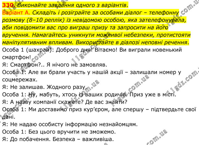 330. Виконайте завдання одного з варіантів. Варіант А. Складіть і розіграйте за особами діалог – телефонну розмову (8–10 реплік) із невідомою особою, яка зателефонувала, аби повідомити вас про виграш призу та запросити на його вручення. Намагайтесь уникнути можливої небезпеки, протистояти маніпулятивним впливам. Використайте в діалозі неповні речення. Особа 1 (шахрай): Доброго дня! Вітаємо! Ви виграли новенький смартфон! Я: Смартфон?.. Я нічого не замовляв. Особа 1: Але ви брали участь у нашій акції – залишали номер у соцмережах. Я: Не залишав. Жодного разу. Особа 1: Ну, мабуть, хтось із ваших родичів. Приз уже в місті. Я: А назву компанії скажете? Де вас знайти? Особа 1: Ми доставимо приз кур’єром, але спершу – підтвердьте свої дані. Я: Не надаю особисту інформацію незнайомцям. Особа 1: Без цього вручити не зможемо. Я: До побачення. Безпека – важливіша.