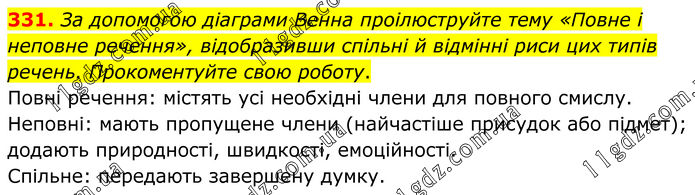 331. За допомогою діаграми Венна проілюструйте тему «Повне і неповне речення», відобразивши спільні й відмінні риси цих типів речень. Прокоментуйте свою роботу. Повні речення: містять усі необхідні члени для повного смислу. Неповні: мають пропущене члени (найчастіше присудок або підмет); додають природності, швидкості, емоційності. Спільне: передають завершену думку.