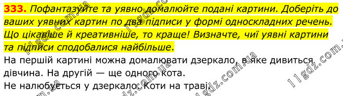 333. Пофантазуйте та уявно домалюйте подані картини. Доберіть до ваших уявних картин по два підписи у формі односкладних речень. Що цікавіше й креативніше, то краще! Визначте, чиї уявні картини та підписи сподобалися найбільше. На першій картині можна домалювати дзеркало, в яке дивиться дівчина. На другій — ще одного кота. Не налюбується у дзеркало. Коти на траві.