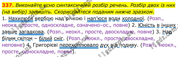 337. Виконайте усно синтаксичний розбір речень. Розбір двох із них (на вибір) запишіть. Скористайтеся поданим нижче зразком. 1. Нахилюся вербою над річкою і нап’юся води холодної. (Розп., неокл., просте, односкладне, означено–ос., повне) 2. Юність в інших завше загадкова. (Розп., неокл., просте, двоскладне, повне) 3. Над білим світом – білий сніг. (Розп., неокл., просте, двоскладне, неповне) 4. Григорієві перехоплювало дух від подиву. (Розп., неокл., просте, односкладне, повне).