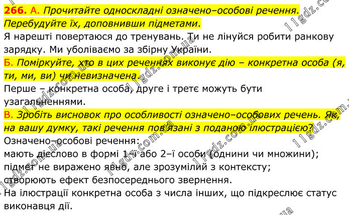 266. А. Прочитайте односкладні означено–особові речення. Перебудуйте їх, доповнивши підметами. Я нарешті повертаюся до тренувань. Ти не лінуйся робити ранкову зарядку. Ми уболіваємо за збірну України. Б. Поміркуйте, хто в цих реченнях виконує дію – конкретна особа (я, ти, ми, ви) чи невизначена. Перше – конкретна особа, друге і третє можуть бути узагальненнями. В. Зробіть висновок про особливості означено–особових речень. Як, на вашу думку, такі речення пов’язані з поданою ілюстрацією? Означено–особові речення: мають дієслово в формі 1–ї або 2–ї особи (однини чи множини); підмет не виражено явно, але зрозумілий з контексту; створюють ефект безпосереднього звернення. На ілюстрації конкретна особа з числа інших, що підкреслює статус виконавця дії.