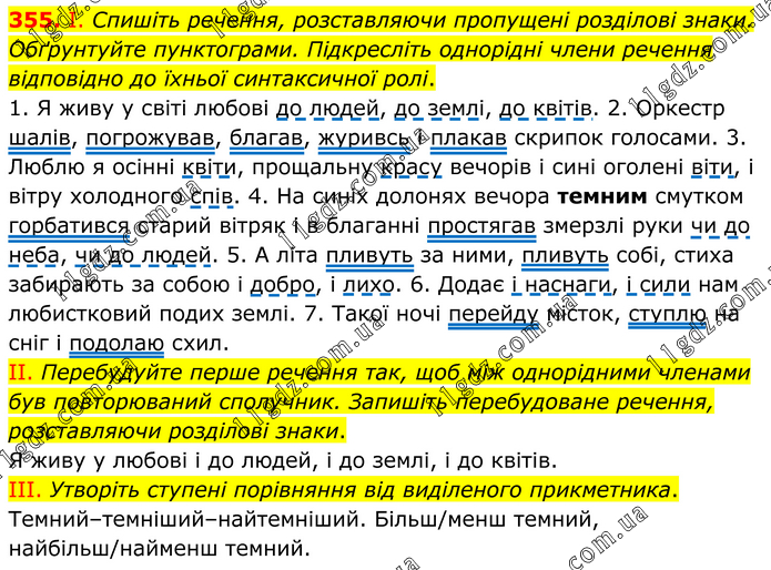 І. Спишіть речення, розставляючи пропущені розділові знаки. Обґрунтуйте пунктограми. Підкресліть однорідні члени речення відповідно до їхньої синтаксичної ролі. 1. Я живу у світі любові до людей, до землі, до квітів. 2. Оркестр шалів, погрожував, благав, журивсь і плакав скрипок голосами. 3. Люблю я осінні квіти, прощальну красу вечорів і сині оголені віти, і вітру холодного спів. 4. На синіх долонях вечора темним смутком горбатився старий вітряк і в благанні простягав змерзлі руки чи до неба, чи до людей. 5. А літа пливуть за ними, пливуть собі, стиха забирають за собою і добро, і лихо. 6. Додає і наснаги, і сили нам любистковий подих землі. 7. Такої ночі перейду місток, ступлю на сніг і подолаю схил. II. Перебудуйте перше речення так, щоб між однорідними членами був повторюваний сполучник. Запишіть перебудоване речення, розставляючи розділові знаки. Я живу у любові і до людей, і до землі, і до квітів. III. Утворіть ступені порівняння від виділеного прикметника. Темний–темніший–найтемніший. Більш/менш темний, найбільш/найменш темний.