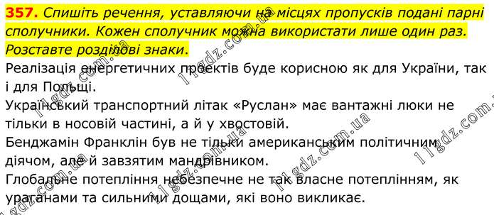 Спишіть речення, уставляючи на місцях пропусків подані парні сполучники. Кожен сполучник можна використати лише один раз. Розставте розділові знаки. Реалізація енергетичних проектів буде корисною як для України, так і для Польщі. Український транспортний літак «Руслан» має вантажні люки не тільки в носовій частині, а й у хвостовій. Бенджамін Франклін був не тільки американським політичним діячом, але й завзятим мандрівником. Глобальне потепління небезпечне не так власне потеплінням, як ураганами та сильними дощами, які воно викликає.