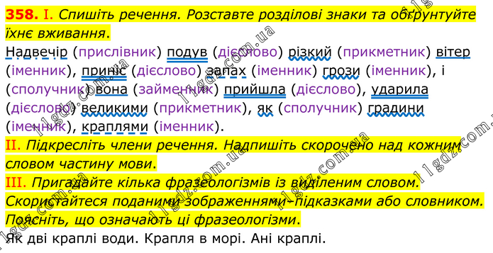 І. Спишіть речення. Розставте розділові знаки та обґрунтуйте їхнє вживання. Надвечір (прислівник) подув (дієслово) різкий (прикметник) вітер (іменник), приніс (дієслово) запах (іменник) грози (іменник), і (сполучник) вона (займенник) прийшла (дієслово), ударила (дієслово) великими (прикметник), як (сполучник) градини (іменник), краплями (іменник). II. Підкресліть члени речення. Надпишіть скорочено над кожним словом частину мови. III. Пригадайте кілька фразеологізмів із виділеним словом. Скористайтеся поданими зображеннями–підказками або словником. Поясніть, що означають ці фразеологізми. Як дві краплі води. Крапля в морі. Ані краплі.