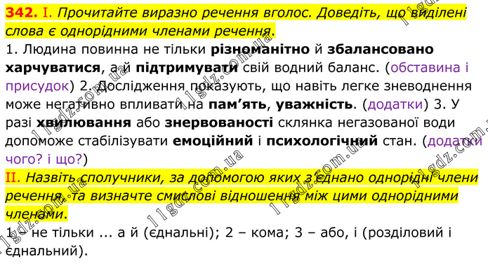 І. Прочитайте виразно речення вголос. Доведіть, що виділені слова є однорідними членами речення. 1. Людина повинна не тільки різноманітно й збалансовано харчуватися, а й підтримувати свій водний баланс. (обставина і присудок) 2. Дослідження показують, що навіть легке зневоднення може негативно впливати на пам’ять, уважність. (додатки) 3. У разі хвилювання або знервованості склянка негазованої води допоможе стабілізувати емоційний і психологічний стан. (додатки чого? і що?) II. Назвіть сполучники, за допомогою яких з’єднано однорідні члени речення, та визначте смислові відношення між цими однорідними членами. 1 – не тільки ... а й (єднальні); 2 – кома; 3 – або, і (розділовий і єднальний).