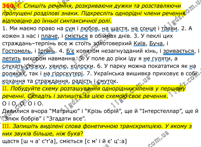 І. Спишіть речення, розкриваючи дужки та розставляючи пропущені розділові знаки. Підкресліть однорідні члени речення відповідно до їхньої синтаксичної ролі. 1. Ми маємо право на сум і любов, на щастя, на сонце і трави. 2. А кожен з нас і плаче, і сміється в обіймах днів. 3. У пеклі цих страждань–терпінь все ж стоїть золотоверхий Київ, Буча, і Гостомель, і Ірпінь. 4. Б’є копитом незагнузданий кінь, і зривається, і летить вихором навмання. 5. У поле до ріки іду я не гуляти, а слухать стежку, хвилю, колоски. 6. У парку можна покататися як на роликах, так і на гіроскутері. 7. Українська вишивка приховує в собі кохання та страждання, радість і смуток. II. Побудуйте схему розташування однорідних членів у першому реченні. Складіть і запишіть за цією схемою своє речення. О і О, О, О і О. Дивилися вчора “Матрицю” і “Крізь обрій”, ще й “Інтерстеллар”, ще й “Злюк бобрів” і “Згадати все”. III. Запишіть виділені слова фонетичною транскрипцією. У якому з них звуків більше, ніж букв? щастя [ш ч а' с'т'а], сміється [с м' і й є' ц':а]