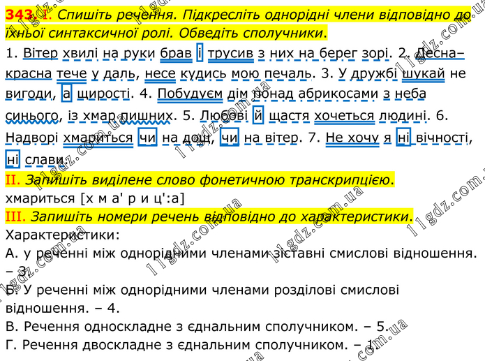 І. Спишіть речення. Підкресліть однорідні члени відповідно до їхньої синтаксичної ролі. Обведіть сполучники. 1. Вітер хвилі на руки брав і трусив з них на берег зорі. 2. Десна–красна тече у даль, несе кудись мою печаль. 3. У дружбі шукай не вигоди, а щирості. 4. Побудуєм дім понад абрикосами з неба синього, із хмар пишних. 5. Любові й щастя хочеться людині. 6. Надворі хмариться чи на дощ, чи на вітер. 7. Не хочу я ні вічності, ні слави. II. Запишіть виділене слово фонетичною транскрипцією. хмариться [х м а' р и ц':а] III. Запишіть номери речень відповідно до характеристики. Характеристики: А. у реченні між однорідними членами зіставні смислові відношення. – 3. Б. У реченні між однорідними членами розділові смислові відношення. – 4. В. Речення односкладне з єднальним сполучником. – 5. Г. Речення двоскладне з єднальним сполучником. – 1.