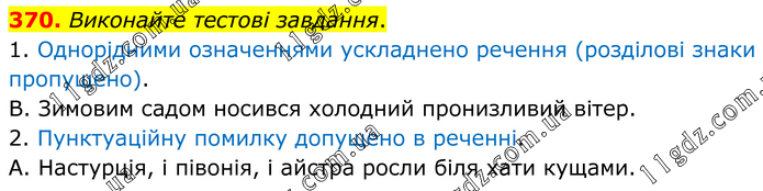 Виконайте тестові завдання. 1. Однорідними означеннями ускладнено речення (розділові знаки пропущено). В. Зимовим садом носився холодний пронизливий вітер. 2. Пунктуаційну помилку допущено в реченні. А. Настурція, і півонія, і айстра росли біля хати кущами.