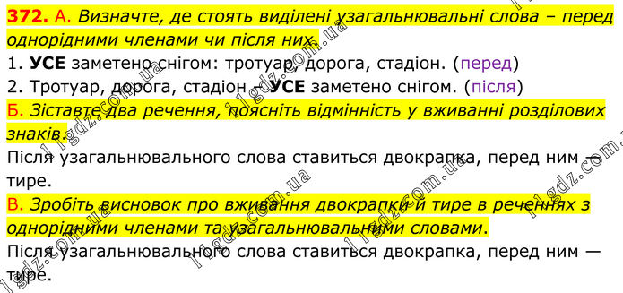 А. Визначте, де стоять виділені узагальнювальні слова – перед однорідними членами чи після них. 1. УСЕ заметено снігом: тротуар, дорога, стадіон. (перед) 2. Тротуар, дорога, стадіон – УСЕ заметено снігом. (після) Б. Зіставте два речення, поясніть відмінність у вживанні розділових знаків. Після узагальнювального слова ставиться двокрапка, перед ним — тире. В. Зробіть висновок про вживання двокрапки й тире в реченнях з однорідними членами та узагальнювальними словами. Після узагальнювального слова ставиться двокрапка, перед ним — тире.