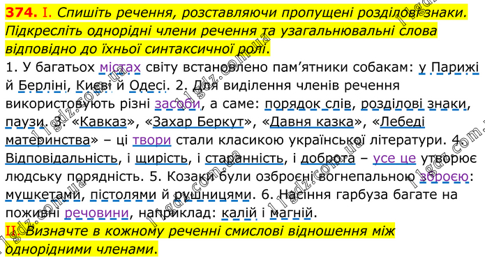 І. Спишіть речення, розставляючи пропущені розділові знаки. Підкресліть однорідні члени речення та узагальнювальні слова відповідно до їхньої синтаксичної ролі. 1. У багатьох містах світу встановлено пам’ятники собакам: у Парижі й Берліні, Києві й Одесі. 2. Для виділення членів речення використовують різні засоби, а саме: порядок слів, розділові знаки, паузи. 3. «Кавказ», «Захар Беркут», «Давня казка», «Лебеді материнства» – ці твори стали класикою української літератури. 4. Відповідальність, і щирість, і старанність, і доброта – усе це утворює людську порядність. 5. Козаки були озброєні вогнепальною зброєю: мушкетами, пістолями й рушницями. 6. Насіння гарбуза багате на поживні речовини, наприклад: калій і магній. II. Визначте в кожному реченні смислові відношення між однорідними членами.