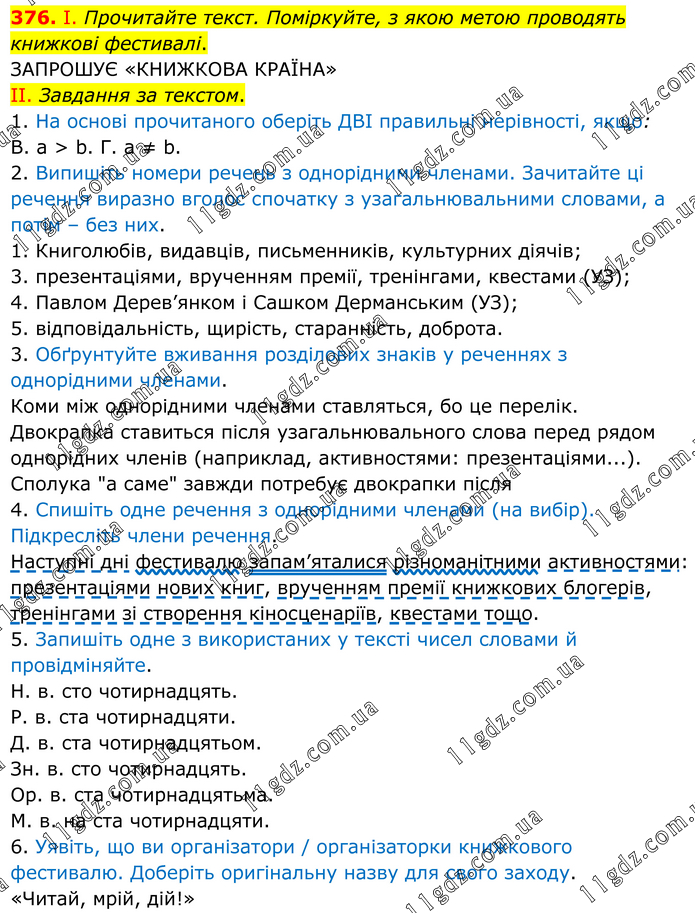 І. Прочитайте текст. Поміркуйте, з якою метою проводять книжкові фестивалі. ЗАПРОШУЄ «КНИЖКОВА КРАЇНА» II. Завдання за текстом. 1. На основі прочитаного оберіть ДВІ правильні нерівності, якщо: В. а > b. Г. а ≠ b. 2. Випишіть номери речень з однорідними членами. Зачитайте ці речення виразно вголос спочатку з узагальнювальними словами, а потім – без них. 1. Книголюбів, видавців, письменників, культурних діячів; 3. презентаціями, врученням премії, тренінгами, квестами (УЗ); 4. Павлом Дерев’янком і Сашком Дерманським (УЗ); 5. відповідальність, щирість, старанність, доброта. 3. Обґрунтуйте вживання розділових знаків у реченнях з однорідними членами. Коми між однорідними членами ставляться, бо це перелік. Двокрапка ставиться після узагальнювального слова перед рядом однорідних членів (наприклад, активностями: презентаціями...). Сполука "а саме" завжди потребує двокрапки після 4. Спишіть одне речення з однорідними членами (на вибір). Підкресліть члени речення. Наступні дні фестивалю запам’яталися різноманітними активностями: презентаціями нових книг, врученням премії книжкових блогерів, тренінгами зі створення кіносценаріїв, квестами тощо. 5. Запишіть одне з використаних у тексті чисел словами й провідміняйте. Н. в. сто чотирнадцять. Р. в. ста чотирнадцяти. Д. в. ста чотирнадцятьом. Зн. в. сто чотирнадцять. Ор. в. ста чотирнадцятьма. М. в. на ста чотирнадцяти. 6. Уявіть, що ви організатори / організаторки книжкового фестивалю. Доберіть оригінальну назву для свого заходу. «Читай, мрій, дій!»