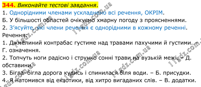 Виконайте тестові завдання. 1. Однорідними членами ускладнено всі речення, ОКРІМ. Б. У більшості областей очікуємо хмарну погоду з проясненнями. 2. З’ясуйте, які члени речення є однорідними в кожному реченні. Речення: 1. Джмелиний контрабас густиме над травами пахучими й густими. – Г. означення. 2. Топчуть ноги радісно і струнко сонні трави на вузькій межі. – Д. обставини. 3. Бігла–бігла дорога кудись і спинилася біля води. – Б. присудки. 4. Я натомився від екзотики, від хитро вигаданих слів. – В. додатки.