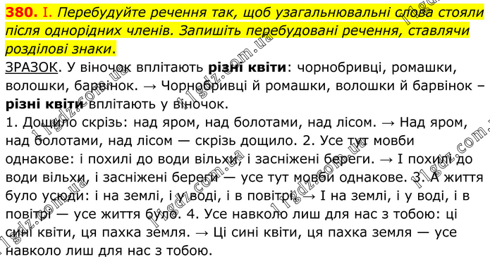 І. Перебудуйте речення так, щоб узагальнювальні слова стояли після однорідних членів. Запишіть перебудовані речення, ставлячи розділові знаки. ЗРАЗОК. У віночок вплітають різні квіти: чорнобривці, ромашки, волошки, барвінок. → Чорнобривці й ромашки, волошки й барвінок –різні квіти вплітають у віночок. 1. Дощило скрізь: над яром, над болотами, над лісом. → Над яром, над болотами, над лісом — скрізь дощило. 2. Усе тут мовби однакове: і похилі до води вільхи, і засніжені береги. → І похилі до води вільхи, і засніжені береги — усе тут мовби однакове. 3. А життя було усюди: і на землі, і у воді, і в повітрі. → І на землі, і у воді, і в повітрі — усе життя було. 4. Усе навколо лиш для нас з тобою: ці сині квіти, ця пахка земля. → Ці сині квіти, ця пахка земля — усе навколо лиш для нас з тобою.