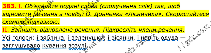 І. Об’єднайте подані слова (сполучення слів) так, щоб відновити речення з повісті О. Донченка «Лісничиха». Скористайтеся схемою–підказкою. II. Запишіть відновлене речення. Підкресліть члени речення. Усі голоси: і зяблика, і зеленушки, і вісянки, і навіть одуда — заглушувало кування зозулі.
