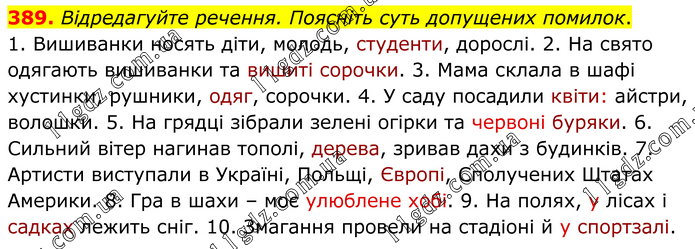 Відредагуйте речення. Поясніть суть допущених помилок. 1. Вишиванки носять діти, молодь, студенти, дорослі. 2. На свято одягають вишиванки та вишиті сорочки. 3. Мама склала в шафі хустинки, рушники, одяг, сорочки. 4. У саду посадили квіти: айстри, волошки. 5. На грядці зібрали зелені огірки та червоні буряки. 6. Сильний вітер нагинав тополі, дерева, зривав дахи з будинків. 7. Артисти виступали в Україні, Польщі, Європі, Сполучених Штатах Америки. 8. Гра в шахи – моє улюблене хобі. 9. На полях, у лісах і садках лежить сніг. 10. Змагання провели на стадіоні й у спортзалі.