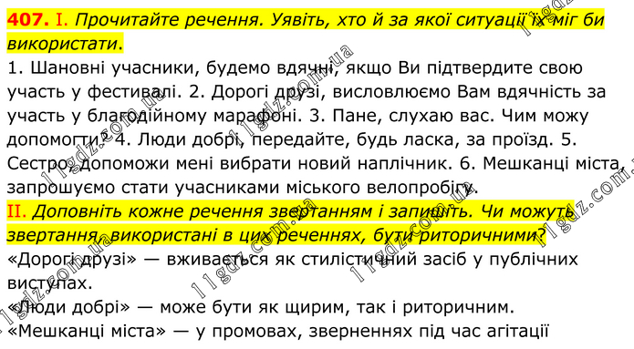 І. Прочитайте речення. Уявіть, хто й за якої ситуації їх міг би використати. 1. Шановні учасники, будемо вдячні, якщо Ви підтвердите свою участь у фестивалі. 2. Дорогі друзі, висловлюємо Вам вдячність за участь у благодійному марафоні. 3. Пане, слухаю вас. Чим можу допомогти? 4. Люди добрі, передайте, будь ласка, за проїзд. 5. Сестро, допоможи мені вибрати новий наплічник. 6. Мешканці міста, запрошуємо стати учасниками міського велопробігу. II. Доповніть кожне речення звертанням і запишіть. Чи можуть звертання, використані в цих реченнях, бути риторичними? «Дорогі друзі» — вживається як стилістичний засіб у публічних виступах. «Люди добрі» — може бути як щирим, так і риторичним. «Мешканці міста» — у промовах, зверненнях під час агітації.