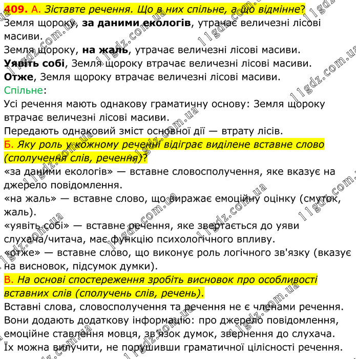 А. Зіставте речення. Що в них спільне, а що відмінне? Земля щороку, за даними екологів, утрачає величезні лісові масиви. Земля щороку, на жаль, утрачає величезні лісові масиви. Уявіть собі, Земля щороку втрачає величезні лісові масиви. Отже, Земля щороку втрачає величезні лісові масиви. Спільне: Усі речення мають однакову граматичну основу: Земля щороку втрачає величезні лісові масиви. Передають однаковий зміст основної дії — втрату лісів. Б. Яку роль у кожному реченні відіграє виділене вставне слово (сполучення слів, речення)? «за даними екологів» — вставне словосполучення, яке вказує на джерело повідомлення. «на жаль» — вставне слово, що виражає емоційну оцінку (смуток, жаль). «уявіть собі» — вставне речення, яке звертається до уяви слухача/читача, має функцію психологічного впливу. «отже» — вставне слово, що виконує роль логічного зв'язку (вказує на висновок, підсумок думки). В. На основі спостереження зробіть висновок про особливості вставних слів (сполучень слів, речень). Вставні слова, словосполучення та речення не є членами речення. Вони додають додаткову інформацію: про джерело повідомлення, емоційне ставлення мовця, зв’язок думок, звернення до слухача. Їх можна вилучити, не порушивши граматичної цілісності речення.