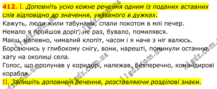 І. Доповніть усно кожне речення одним із поданих вставних слів відповідно до значення, указаного в дужках. Кажуть, люди жили табунами, спали покотом в млі печер. Немало я пройшов доріг, не раз, бувало, помилявся. Маєш, напевно, чималий клопіт, часом і я наче з ніг валюсь. Борсаючись у глибокому снігу, вони, нарешті, поминули останню хату на околиці села. Голос, що пролунав у коридорі, належав, безперечно, командирові корабля. II. Запишіть доповнені речення, розставляючи розділові знаки.