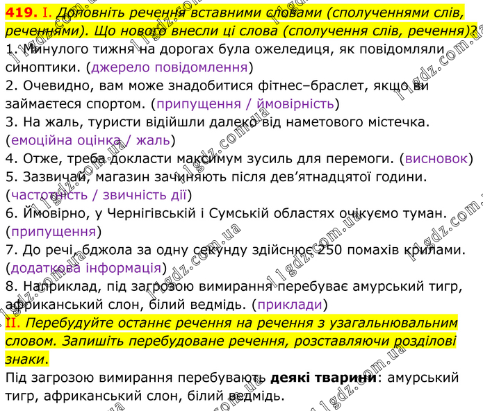 І. Доповніть речення вставними словами (сполученнями слів, реченнями). Що нового внесли ці слова (сполучення слів, речення)? 1. Минулого тижня на дорогах була ожеледиця, як повідомляли синоптики. (джерело повідомлення) 2. Очевидно, вам може знадобитися фітнес–браслет, якщо ви займаєтеся спортом. (припущення / ймовірність) 3. На жаль, туристи відійшли далеко від наметового містечка. (емоційна оцінка / жаль) 4. Отже, треба докласти максимум зусиль для перемоги. (висновок) 5. Зазвичай, магазин зачиняють після дев’ятнадцятої години. (частотність / звичність дії) 6. Ймовірно, у Чернігівській і Сумській областях очікуємо туман. (припущення) 7. До речі, бджола за одну секунду здійснює 250 помахів крилами. (додаткова інформація) 8. Наприклад, під загрозою вимирання перебуває амурський тигр, африканський слон, білий ведмідь. (приклади) II. Перебудуйте останнє речення на речення з узагальнювальним словом. Запишіть перебудоване речення, розставляючи розділові знаки. Під загрозою вимирання перебувають деякі тварини: амурський тигр, африканський слон, білий ведмідь.