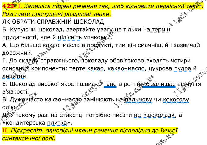 І. Запишіть подані речення так, щоб відновити первісний текст. Розставте пропущені розділові знаки. ЯК ОБРАТИ СПРАВЖНІЙ ШОКОЛАД Б. Купуючи шоколад, звертайте увагу не тільки на термін придатності, але й цілісніть упаковки. А. Що більше какао–масла в продукті, тим він смачніший і зазвичай дорожчий. Г. До складу справжнього шоколаду обов’язково входять чотири основних компоненти: терте какао, какао–масло, цукрова пудра й лецитин. Е. Шоколад високої якості швидко тане в роті й не залишає відчуття в’язкості. В. Дуже часто какао–масло замінюють на пальмову чи кокосову олію. Д. У такому разі на етикетці потрібно писати не «шоколад», а «кондитерська плитка». II. Підкресліть однорідні члени речення відповідно до їхньої синтаксичної ролі.