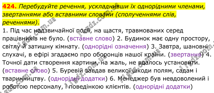 Перебудуйте речення, ускладнивши їх однорідними членами, звертаннями або вставними словами (сполученнями слів, реченнями). 1. Під час надзвичайної події, на щастя, травмованих серед працівників не було. (вставне слово) 2. Будинок має одну простору, світлу й затишну кімнату. (однорідні означення) 3. Завтра, шановні слухачі, в ефірі згадаємо про оборонців нашої країни. (звертання) 4. Точної дати створення картини, на жаль, не вдалось установити. (вставне слово) 5. Буревій завдав великої шкоди полям, садам і тваринництву. (однорідні додатки) 6. Менеджер був невдоволений і роботою персоналу, і поведінкою клієнтів. (однорідні додатки)