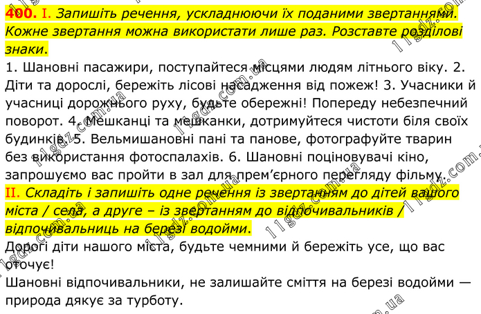 І. Запишіть речення, ускладнюючи їх поданими звертаннями. Кожне звертання можна використати лише раз. Розставте розділові знаки. 1. Шановні пасажири, поступайтеся місцями людям літнього віку. 2. Діти та дорослі, бережіть лісові насадження від пожеж! 3. Учасники й учасниці дорожнього руху, будьте обережні! Попереду небезпечний поворот. 4. Мешканці та мешканки, дотримуйтеся чистоти біля своїх будинків. 5. Вельмишановні пані та панове, фотографуйте тварин без використання фотоспалахів. 6. Шановні поціновувачі кіно, запрошуємо вас пройти в зал для прем’єрного перегляду фільму. II. Складіть і запишіть одне речення із звертанням до дітей вашого міста / села, а друге – із звертанням до відпочивальників / відпочивальниць на березі водойми. Дорогі діти нашого міста, будьте чемними й бережіть усе, що вас оточує! Шановні відпочивальники, не залишайте сміття на березі водойми — природа дякує за турботу.