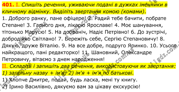 І. Спишіть речення, уживаючи подані в дужках іменники в кличному відмінку. Виділіть звертання комою (комами). 1. Доброго ранку, пане офіцере! 2. Радий тебе бачити, побрате Степане! 3. Гарного дня, лікарю Ярославе! 4. Моє шанування, тітонько Марусю! 5. На добраніч, Надіє Петрівно! 6. До зустрічі, добродійко Світлано! 7. Бережіть себе, Сергію Степановичу! 8. Дякую, друже Віталію. 9. На все добре, подруго Яринко. 10. Усього найкращого, пані редакторко! 11. Шановний, Олександре Петровичу, вітаємо з днем народження! II. Складіть і запишіть два речення, використовуючи як звертання: 1) загальну назву + ім'я; 2) ім'я + ім’я по батькові. 1) Хлопче Дмитре, подай, будь ласка, мені ту книгу. 2) Ірино Василівно, дякуємо вам за цікаву екскурсію!