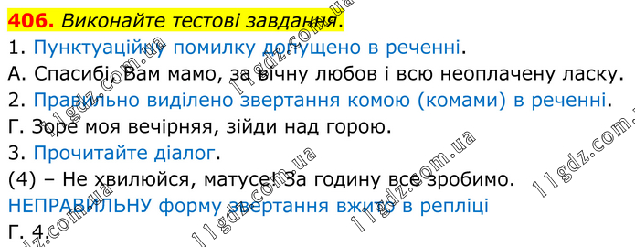 Виконайте тестові завдання. 1. Пунктуаційну помилку допущено в реченні. А. Спасибі, Вам мамо, за вічну любов і всю неоплачену ласку. 2. Правильно виділено звертання комою (комами) в реченні. Г. Зоре моя вечірняя, зійди над горою. 3. Прочитайте діалог. (4) – Не хвилюйся, матусе! За годину все зробимо. НЕПРАВИЛЬНУ форму звертання вжито в репліці Г. 4.