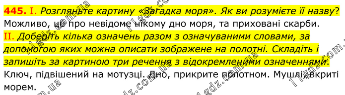 І. Розгляньте картину «Загадка моря». Як ви розумієте її назву? Можливо, це про невідоме нікому дно моря, та приховані скарби. II. Доберіть кілька означень разом з означуваними словами, за допомогою яких можна описати зображене на полотні. Складіть і запишіть за картиною три речення з відокремленими означеннями. Ключ, підвішений на мотузці. Дно, прикрите полотном. Мушлі, вкриті морем.