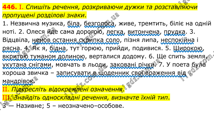 І. Спишіть речення, розкриваючи дужки та розставляючи пропущені розділові знаки. 1. Незвична музика, біла, безголоса, живе, тремтить, біліє на одній ноті. 2. Олеся йде сама дорогою, легка, витончена, прудка. 3. Відцвіла, немов остання скрипка соло, пізня липа, неспокійна і рясна. 4. Як я, бідна, тут горюю, прийди, подивися. 5. Широкою, вкритою туманом долиною, верталися додому. 6. Ще спить земля, укутана снігами, мовчать в льоди, заковані річки. 7. У поета була хороша звичка – записувати в щоденник свої враження від мандрівок. II. Підкресліть відокремлені означення. III. Знайдіть односкладні речення, визначте їхній тип. 3 — Називне; 5 – неозначено–особове.