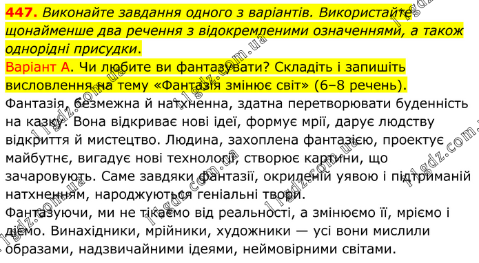 Виконайте завдання одного з варіантів. Використайте щонайменше два речення з відокремленими означеннями, а також однорідні присудки. Варіант А. Чи любите ви фантазувати? Складіть і запишіть висловлення на тему «Фантазія змінює світ» (6–8 речень). Фантазія, безмежна й натхненна, здатна перетворювати буденність на казку. Вона відкриває нові ідеї, формує мрії, дарує людству відкриття й мистецтво. Людина, захоплена фантазією, проектує майбутнє, вигадує нові технології, створює картини, що зачаровують. Саме завдяки фантазії, окриленій уявою і підтриманій натхненням, народжуються геніальні твори. Фантазуючи, ми не тікаємо від реальності, а змінюємо її, мріємо і діємо. Винахідники, мрійники, художники — усі вони мислили образами, надзвичайними ідеями, неймовірними світами.