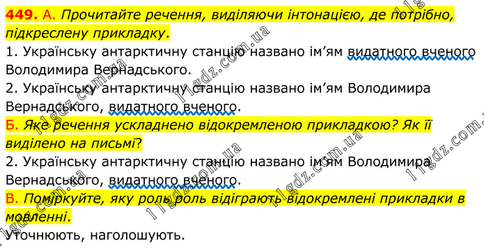 А. Прочитайте речення, виділяючи інтонацією, де потрібно, підкреслену прикладку. 1. Українську антарктичну станцію названо ім’ям видатного вченого Володимира Вернадського. 2. Українську антарктичну станцію названо ім’ям Володимира Вернадського, видатного вченого. Б. Яке речення ускладнено відокремленою прикладкою? Як її виділено на письмі? 2. Українську антарктичну станцію названо ім’ям Володимира Вернадського, видатного вченого. В. Поміркуйте, яку роль роль відіграють відокремлені прикладки в мовленні. Уточнюють, наголошують.